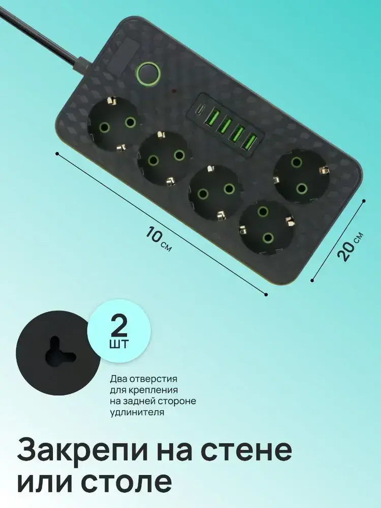 Удлинитель 3 метра, сетевой фильтр с евророзетками, USB и type-C, пилот, тройник