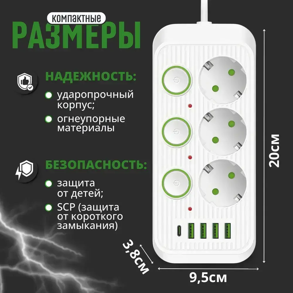 Удлинитель белый 3 кнопки 3 розетки 3 метра