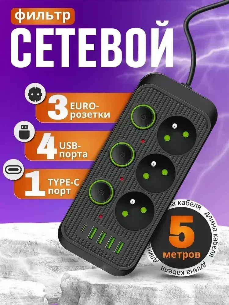 Удлинитель черный 3 кнопки 3 розетки 5 метров
