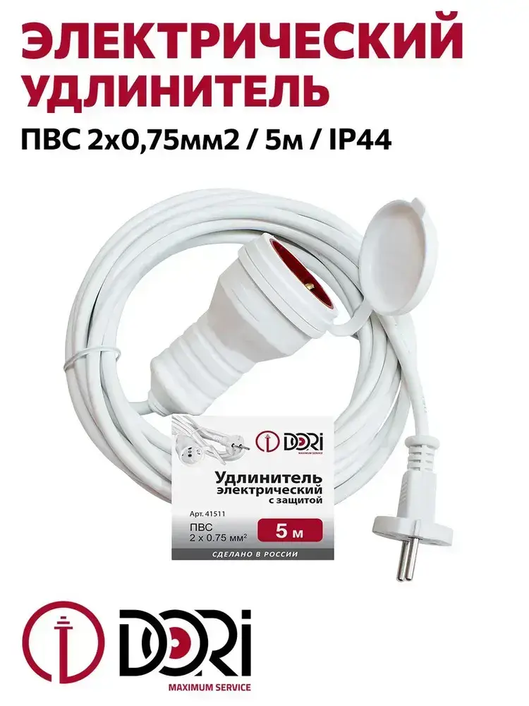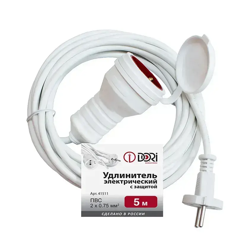 Удлинитель электрический DORI с защитой от влаги (5 м, ПВС 2х0,75 мм2, IP44)