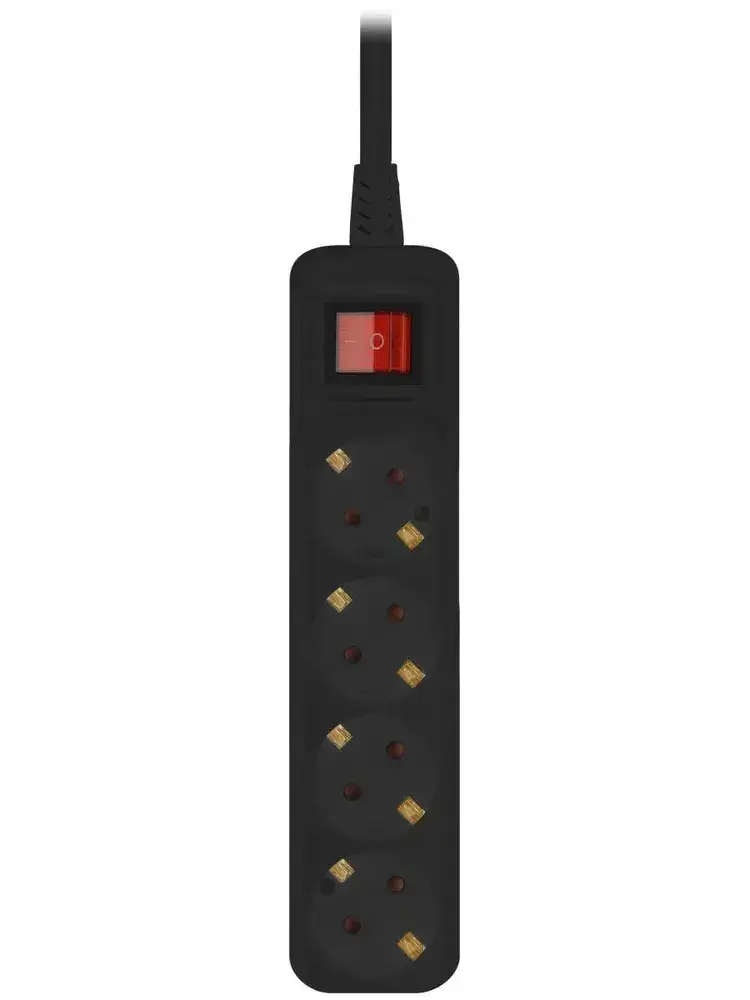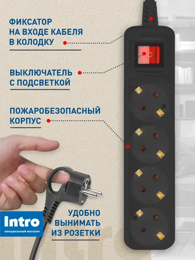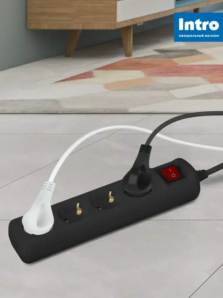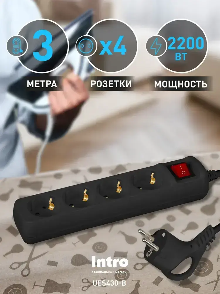 Удлинитель электрический Intro UES430-B с заземлением с выключателем 4 розетки 3 м ПВС 3x0,75мм2 10А черный