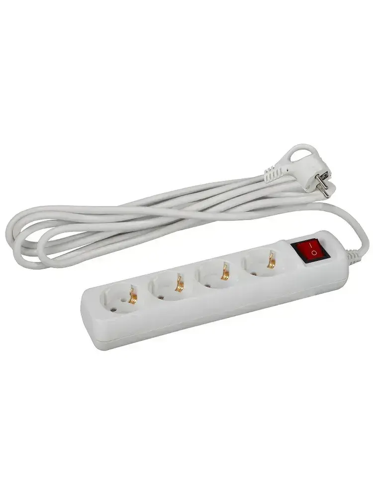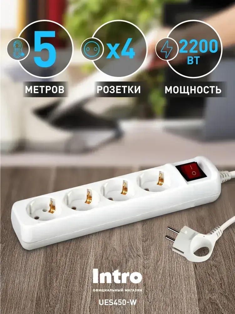 Удлинитель электрический Intro UES450-W с заземлением с выключателем 4 розетки 5м ПВС 3x0,75мм2 10А белый