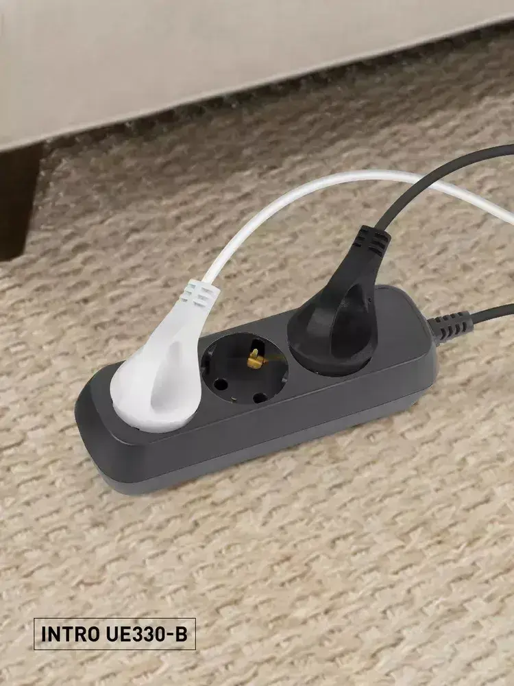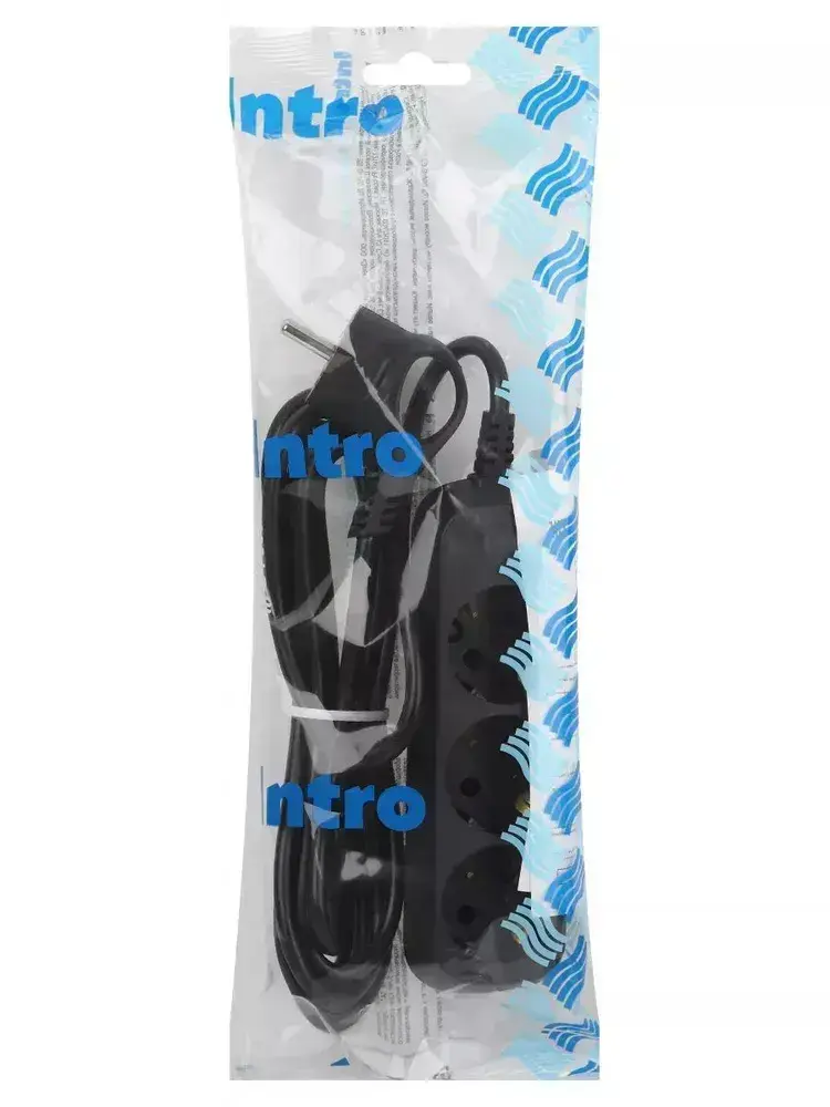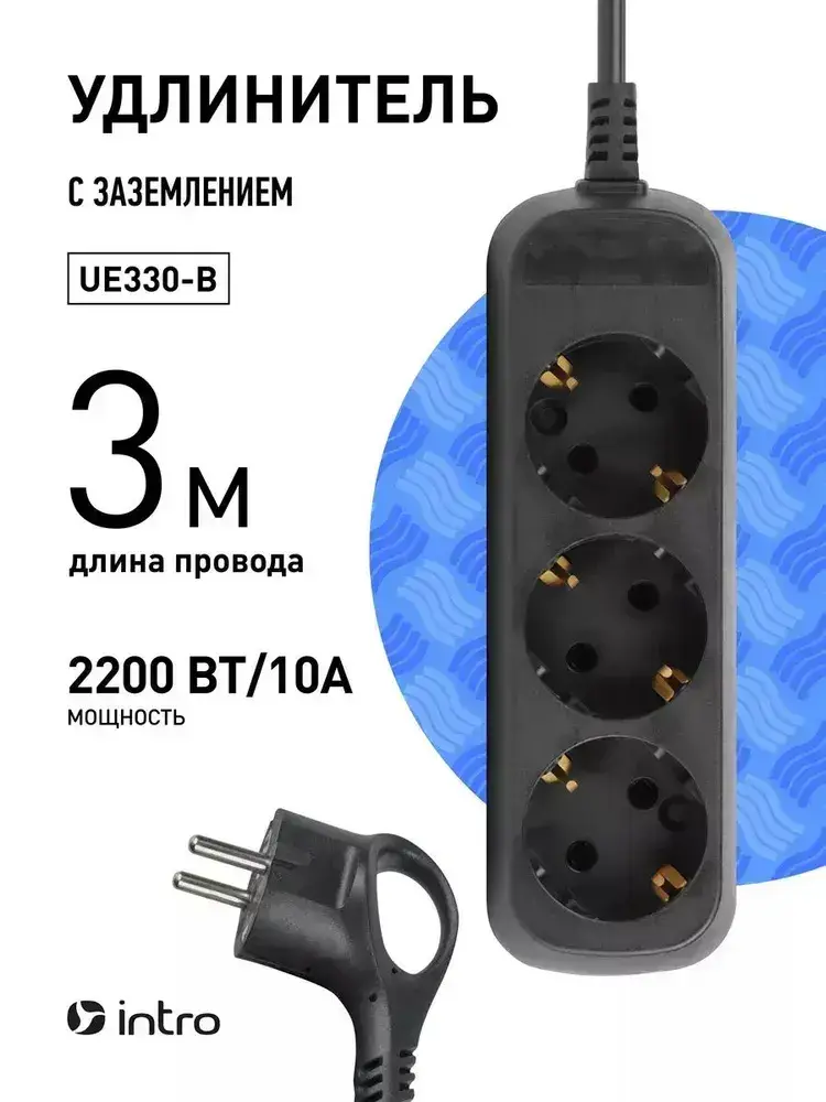 Удлинитель Intro UE330-B сетевой электрический бытовой с заземлением 3 розетки, 3 м, ПВС 3х0,75 мм2, 10А, черный