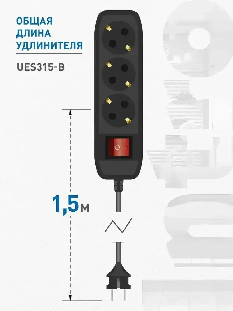 Удлинитель Intro UES315-B сетевой электрический бытовой с заземлением с выключателем 3 розетки, 1,5 м, ПВС 3х0,75 мм2, 10А, черный