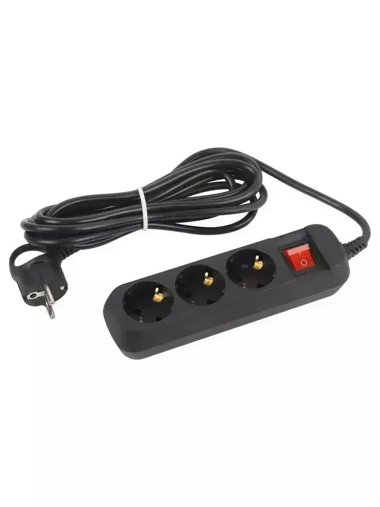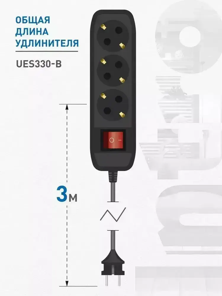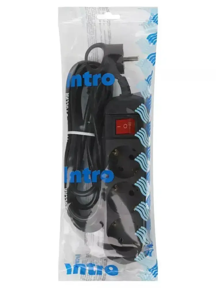 Удлинитель Intro UES330-B сетевой электрический бытовой с заземлением с выключателем 3 розетки, 3 м, ПВС 3х0,75 мм2, 10А, черный