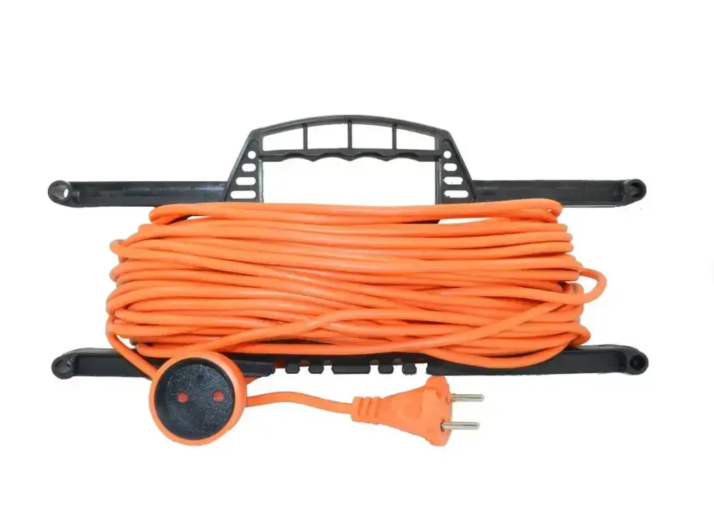 Удлинитель на рамке уличный силовой для сварки ПВС 2х1.5 мм 30 метров, влагозащитный литой штепсель для газонокосилки и триммера. Строительный удлинитель 30 метров, 1 гнездо оранжевый