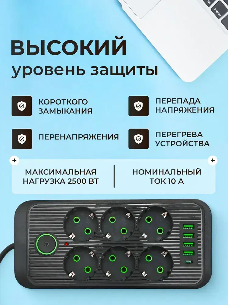 Удлинитель с предохранителем 2500 Вт, сетевой фильтр с usb 2 метра 6 розеток 4 USB 1 Type-C, с единым выключателем
