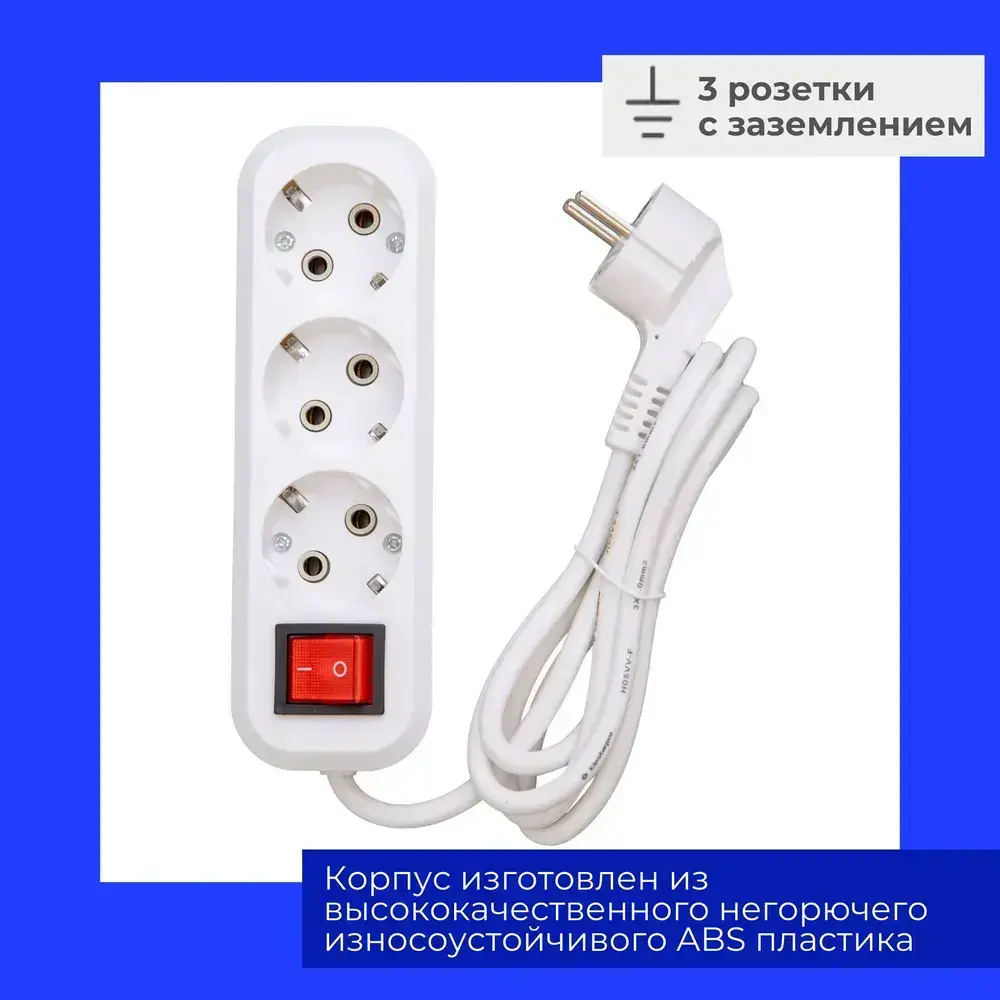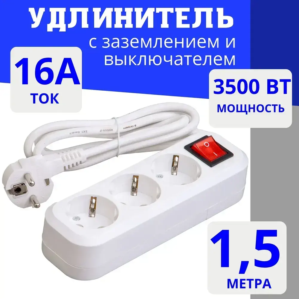 Удлинитель сетевой 1,5 метра с заземлением, с выключателем