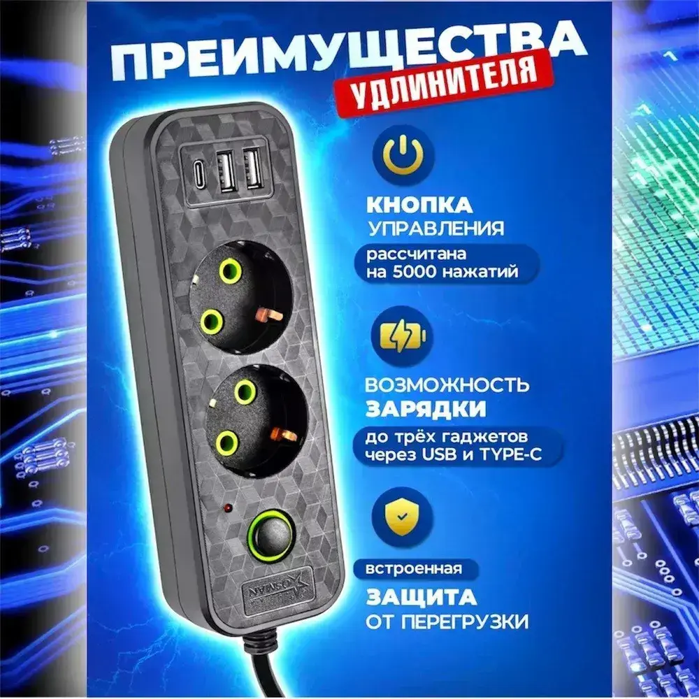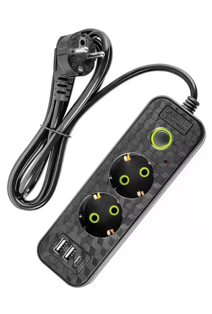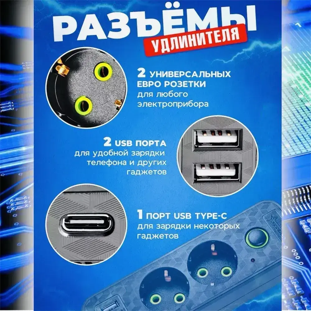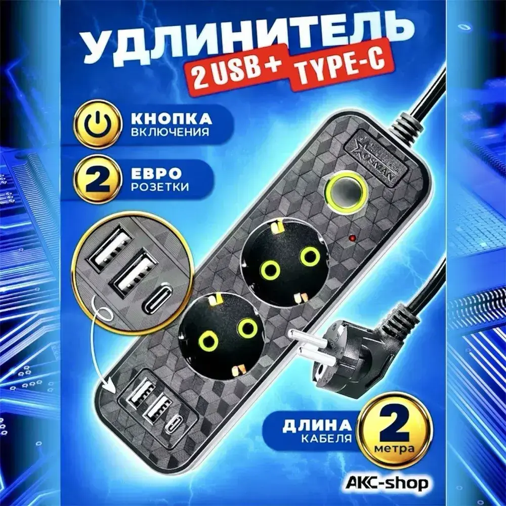 Удлинитель сетевой 2 м / Сетевой фильтр 2 розетки, 2 USB порта, 1 type-C, черный