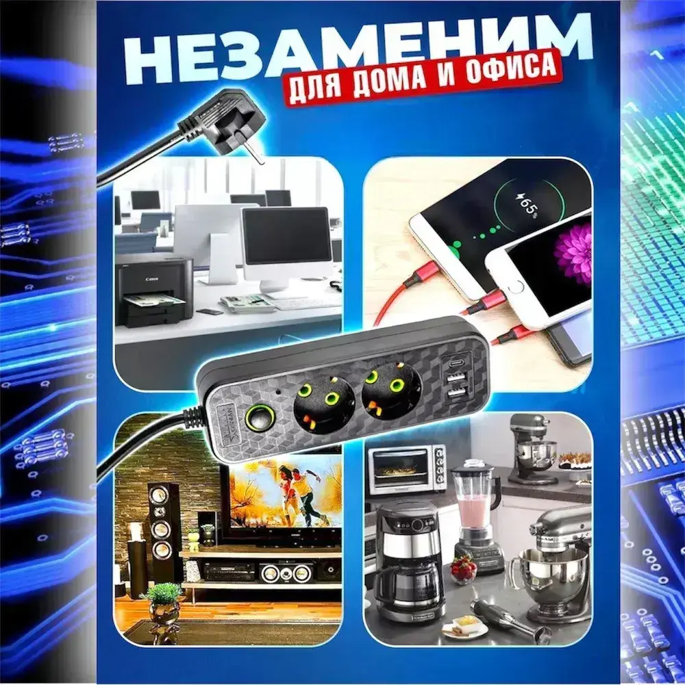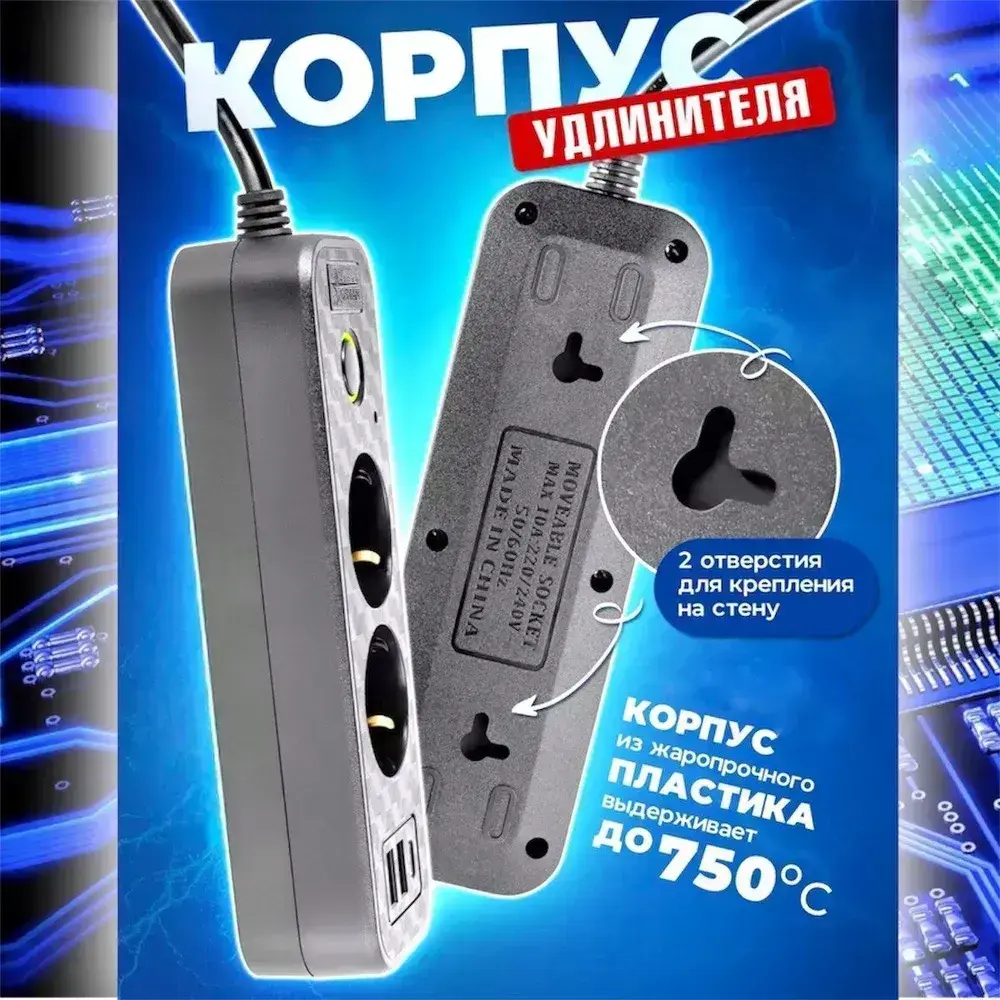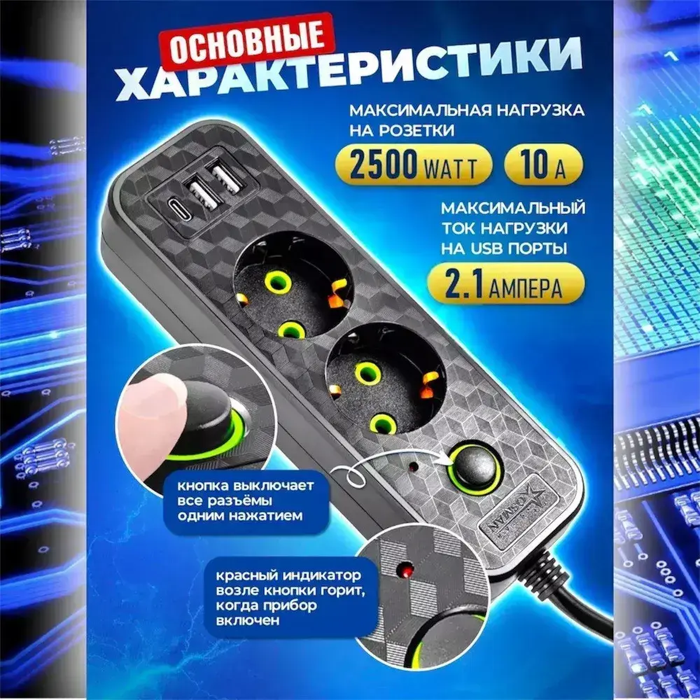 Удлинитель сетевой 2 м / Сетевой фильтр 2 розетки, 2 USB порта, 1 type-C, черный