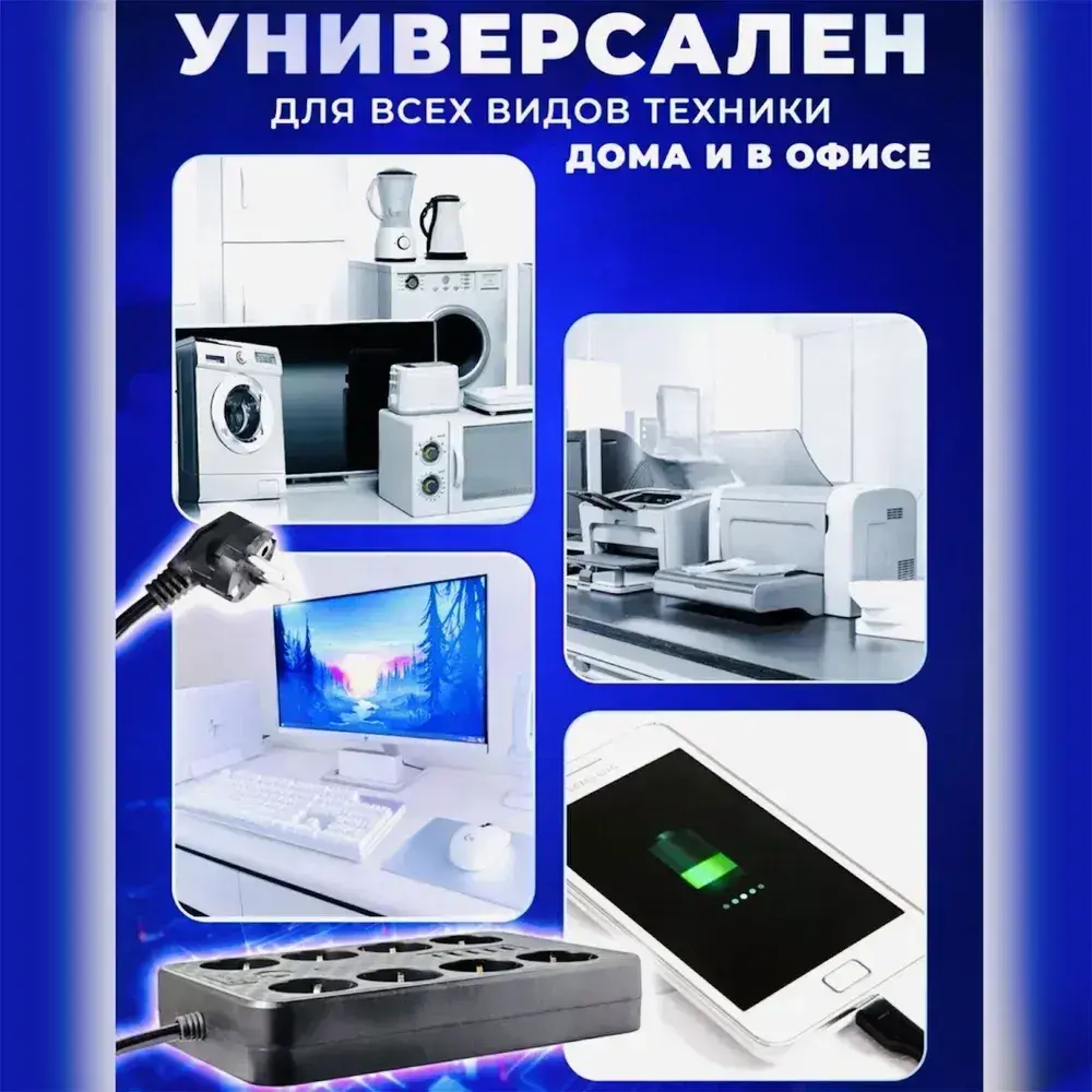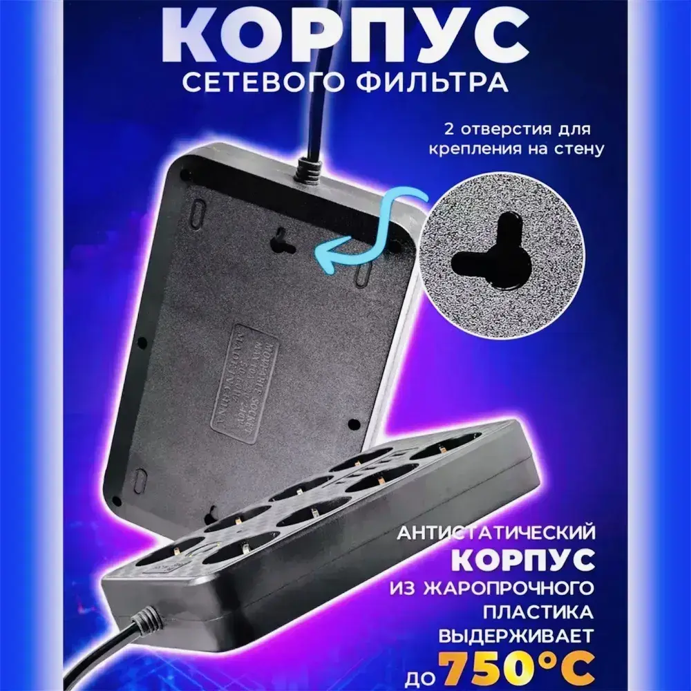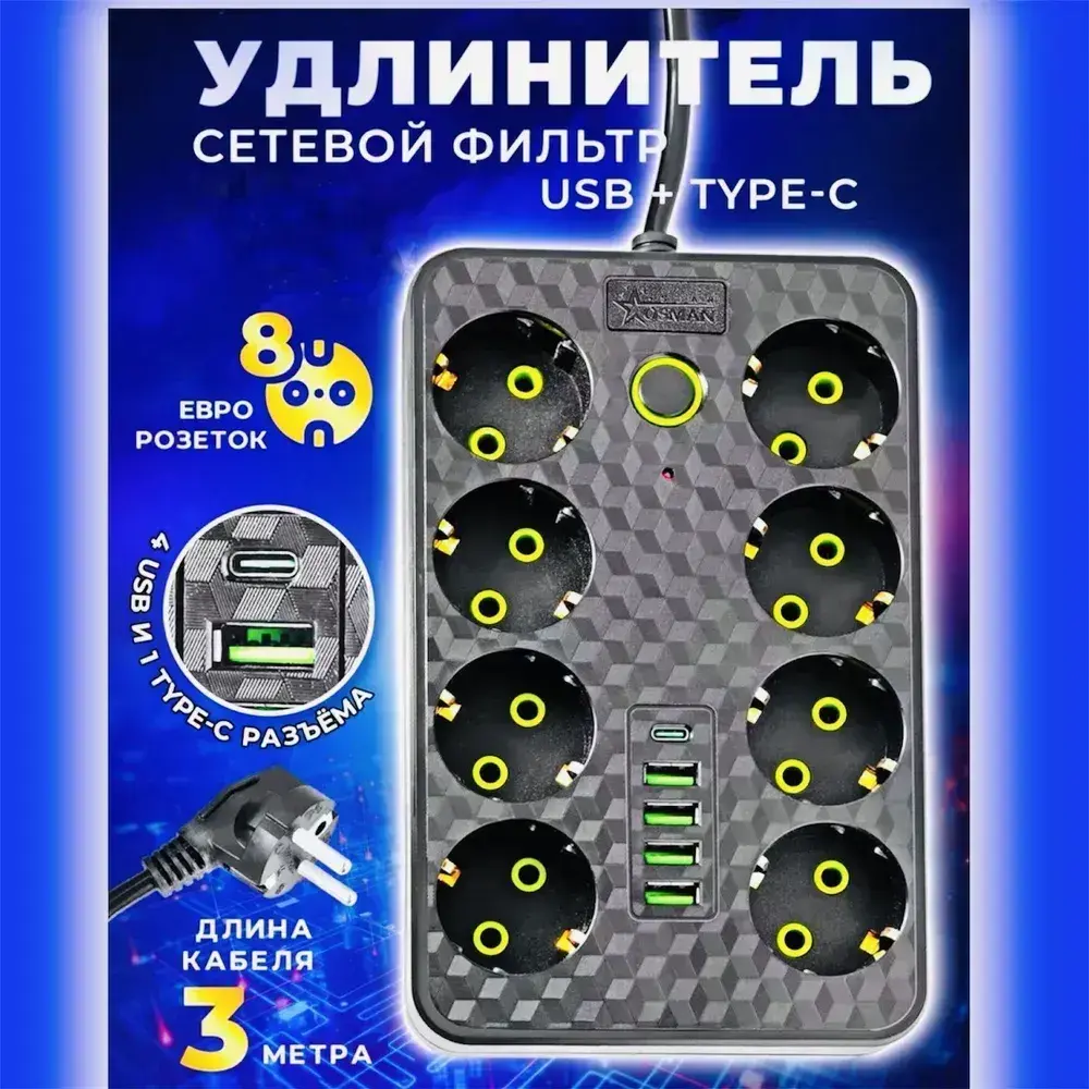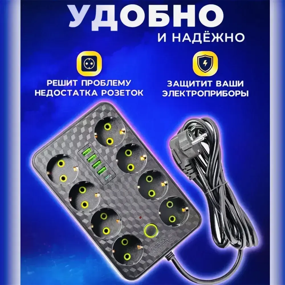 Удлинитель сетевой 3 м / Сетевой фильтр 8 розеток, 4 USB порта, 1 type-C, черный