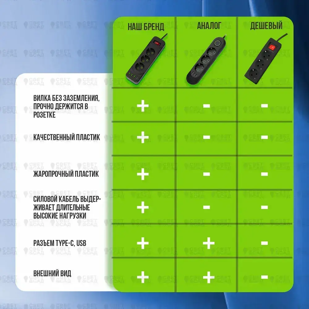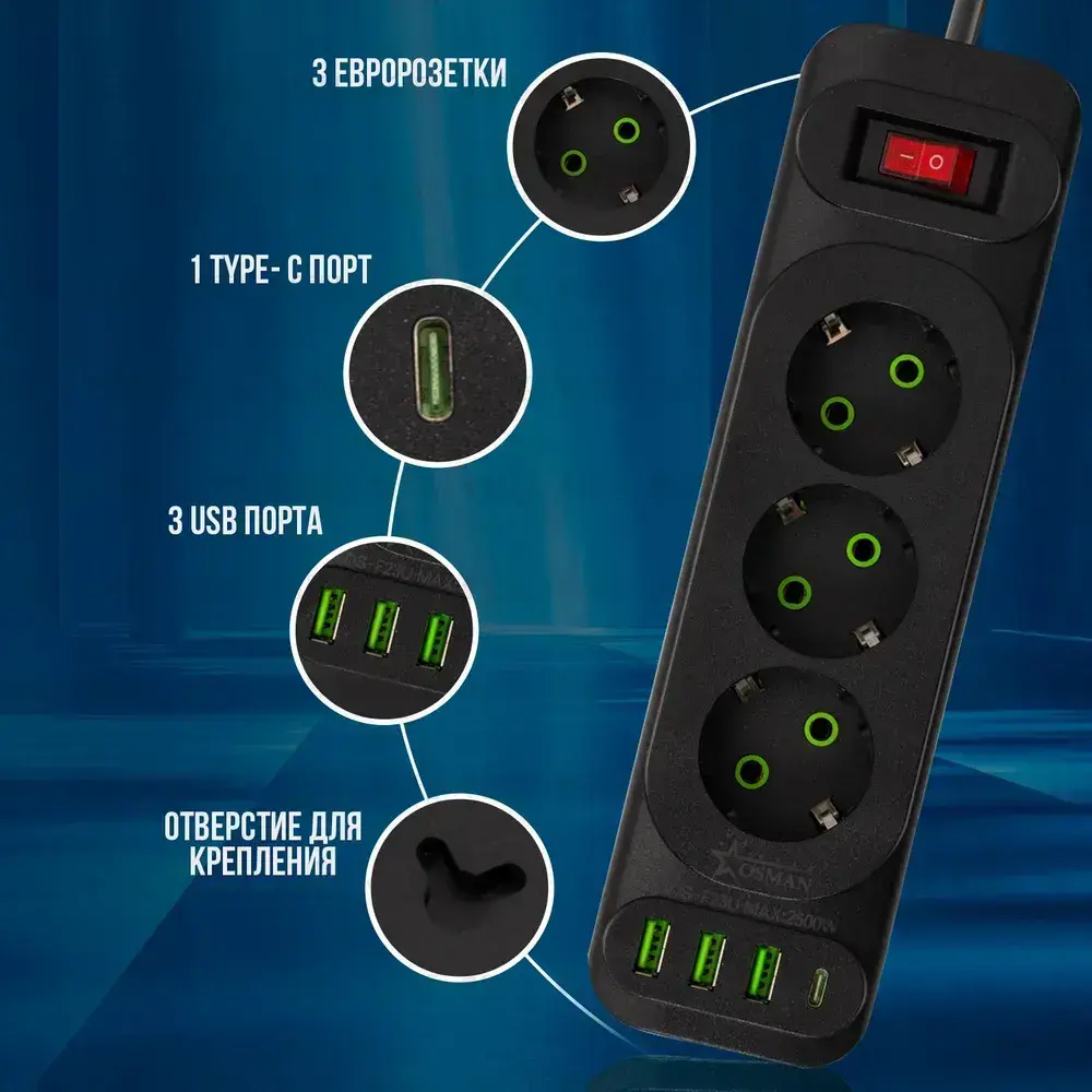 Удлинитель сетевой 3 розетки с заземлением USB Type-C 2м