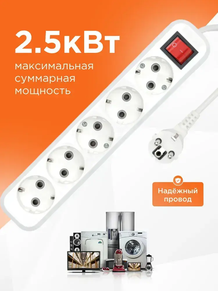 Удлинитель сетевой бытовой Гарнизон с базовой защитой с заземлением с выключателем 2 метра 5 розеток, 10А,1мм2, белый EPB-G5-W-2