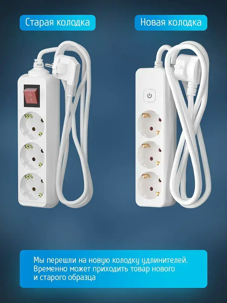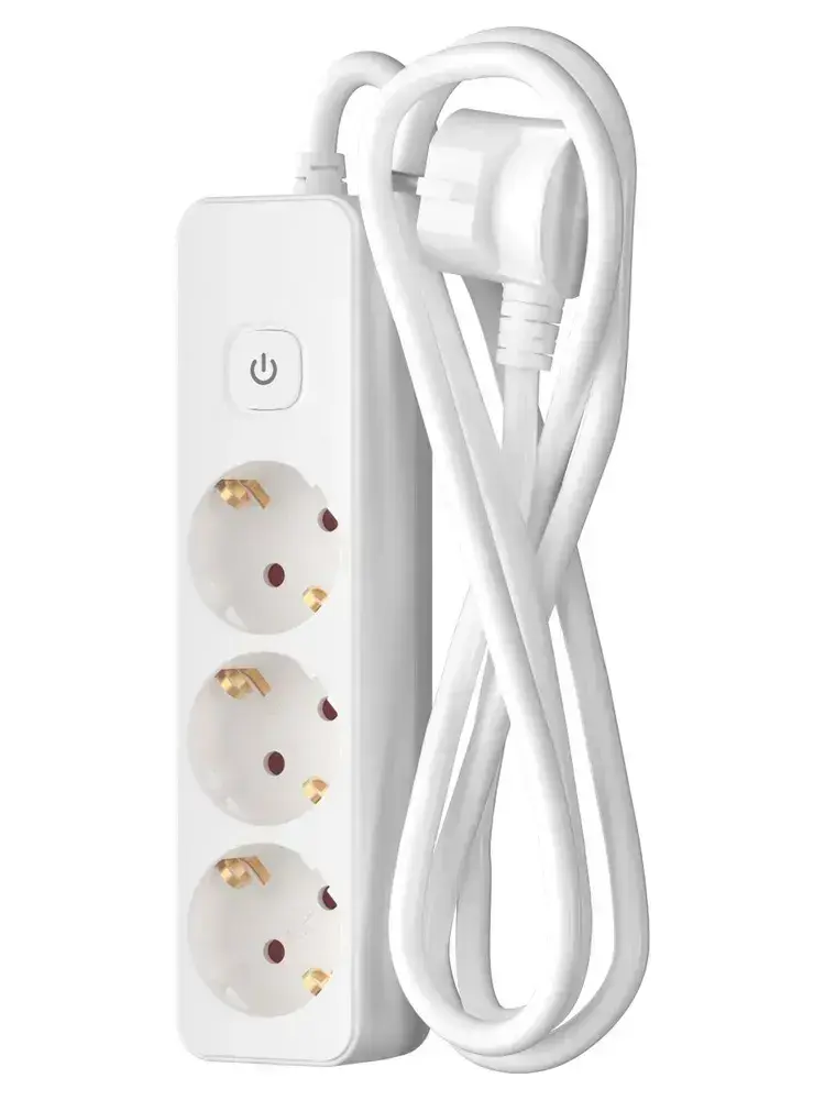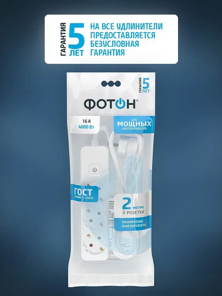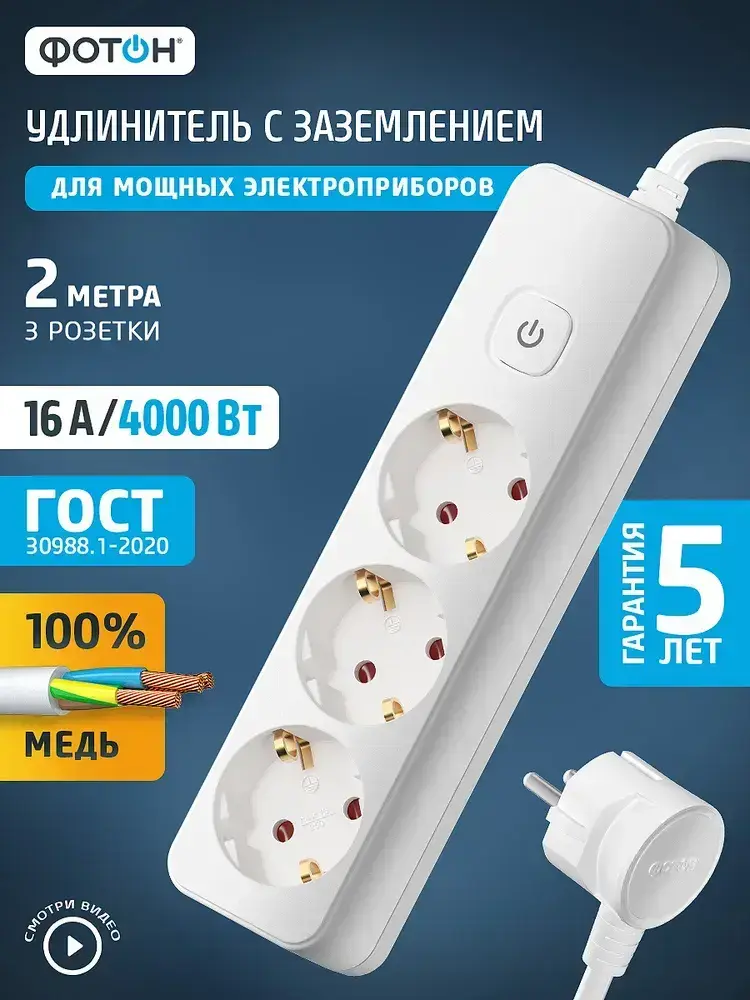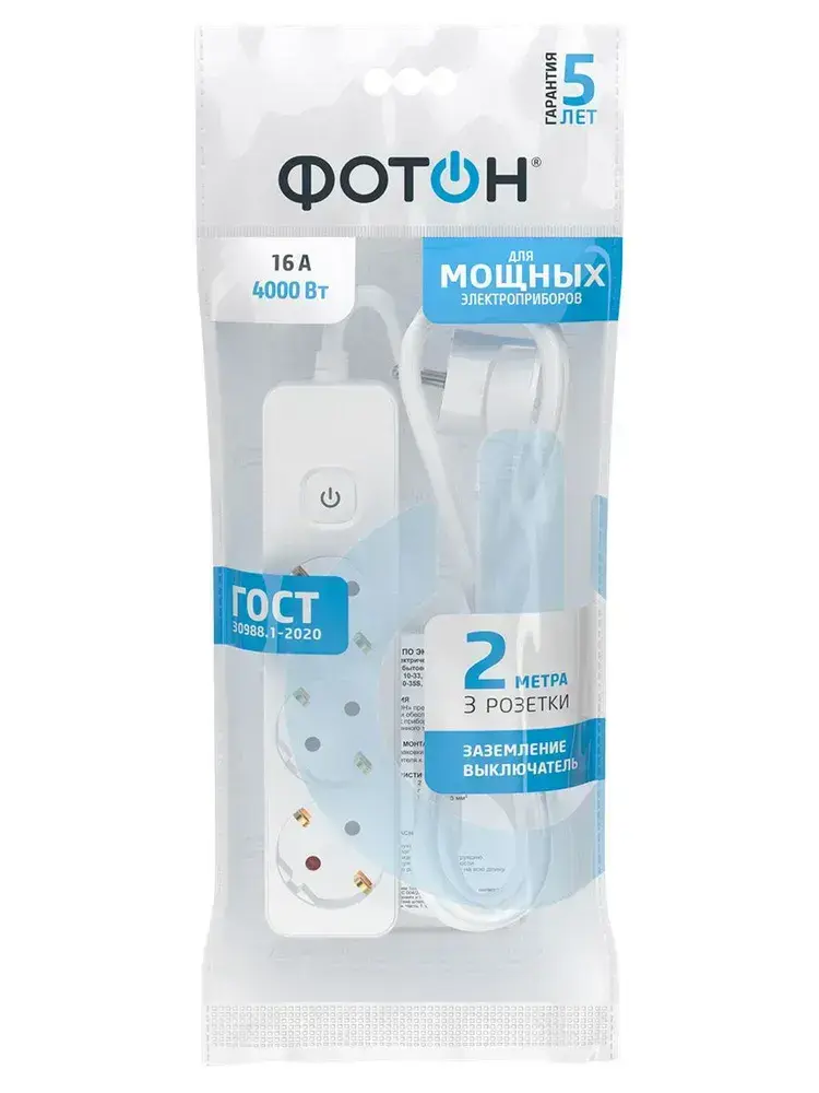 Удлинитель сетевой для розетки ФОТОН 16А 2 метра 3 розетки с выключателем с заземлением белый, ГОСТ