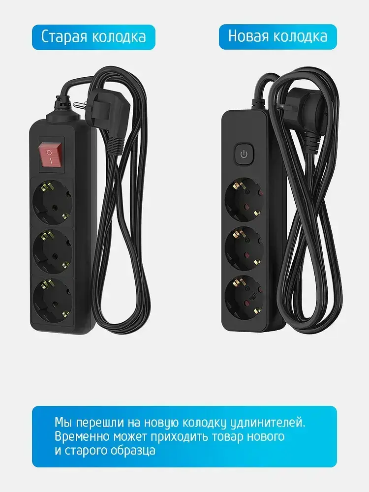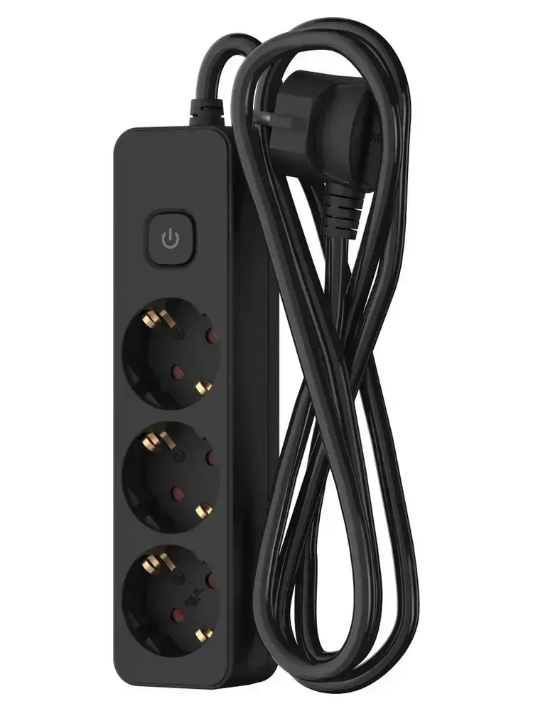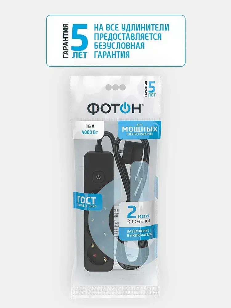 Удлинитель сетевой для розетки ФОТОН 16А 2 метра 3 розетки с выключателем с заземлением черный, ГОСТ