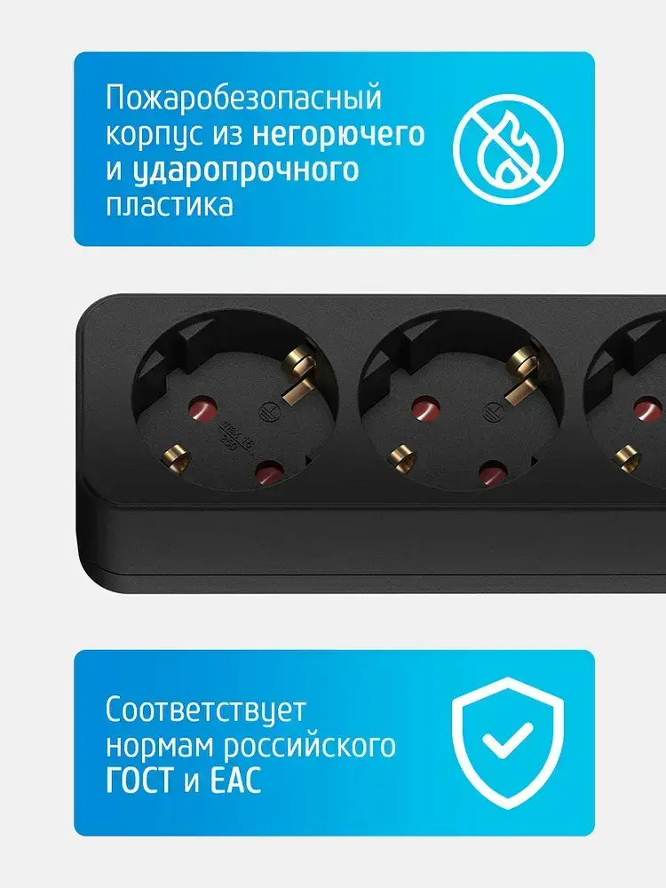 Удлинитель сетевой для розетки ФОТОН 16А 3 метра 3 розетки с выключателем с заземлением черный, ГОСТ