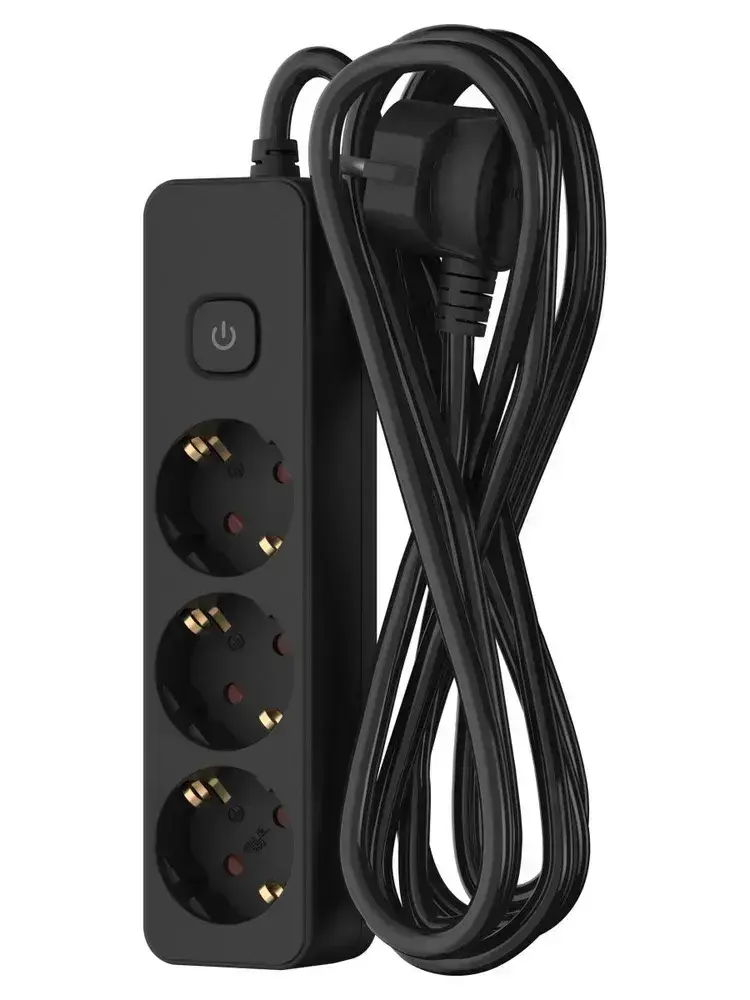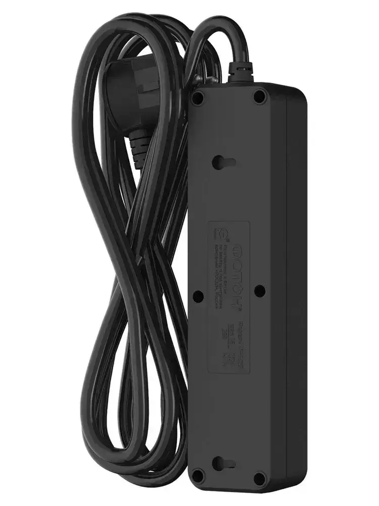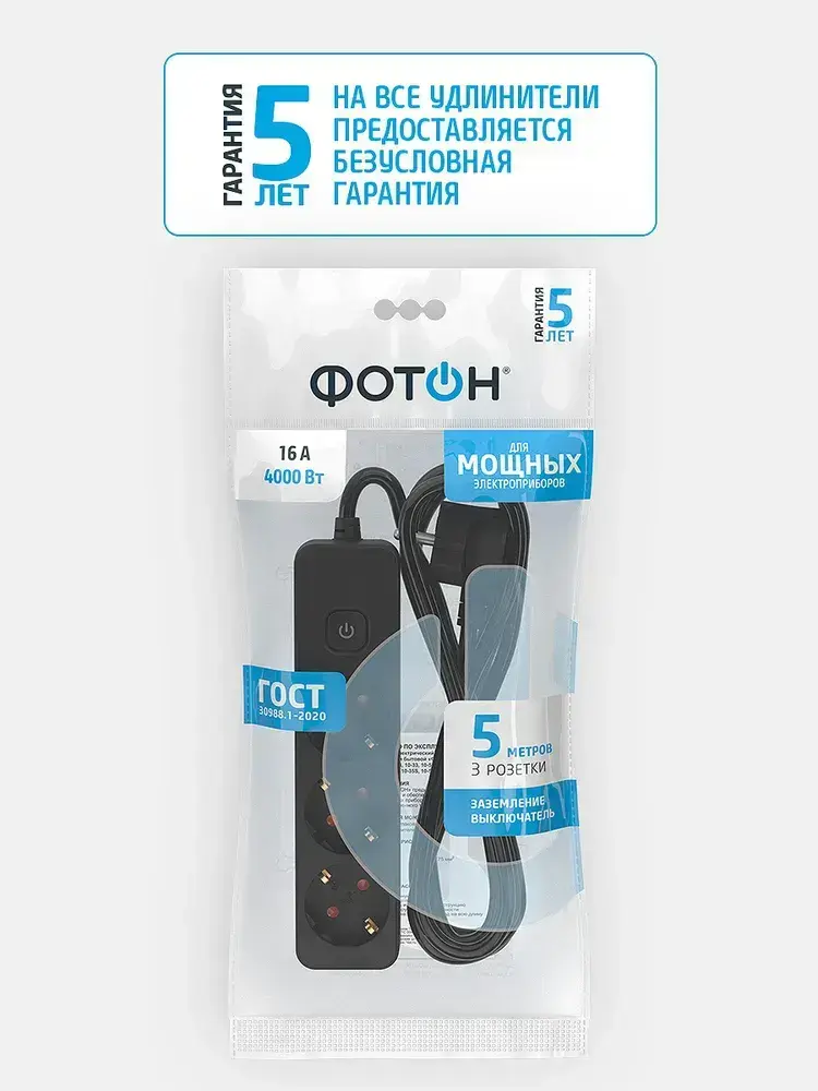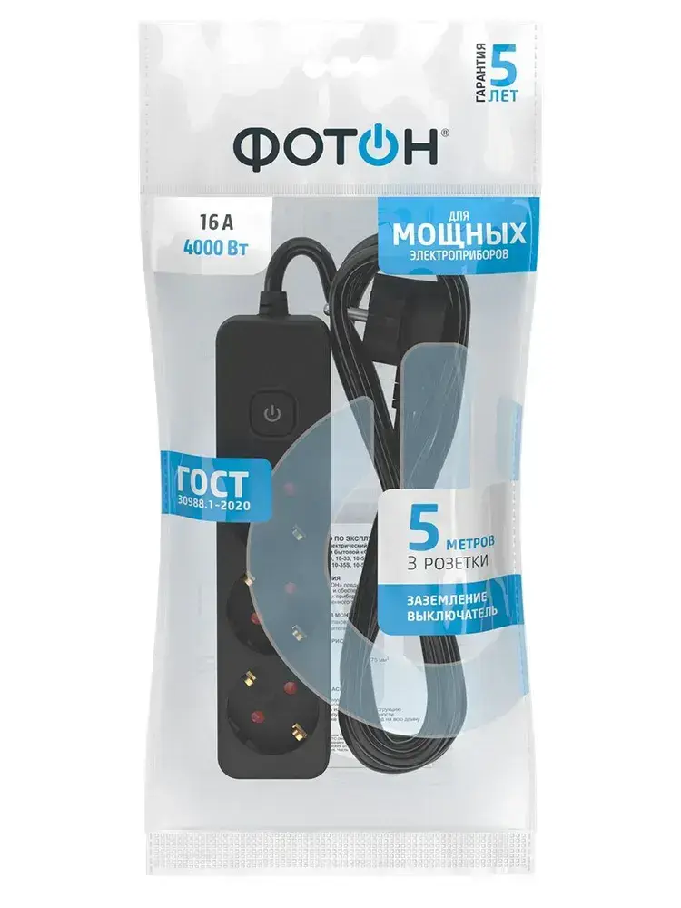 Удлинитель сетевой для розетки ФОТОН 16А 5 метров 3 розетки с выключателем с заземлением черный, ГОСТ