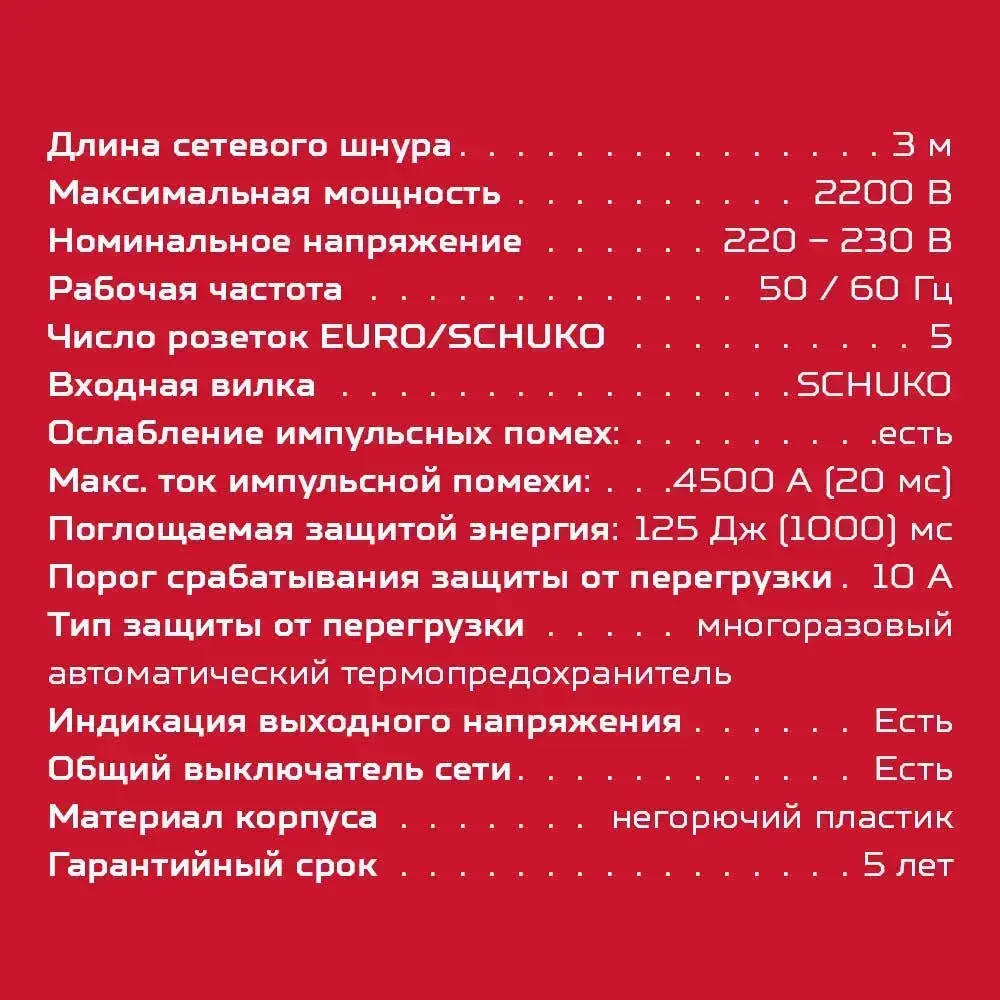Удлинитель сетевой фильтр 3 м 5 гнезд Боезапас 10А, 2200Вт, 220В
