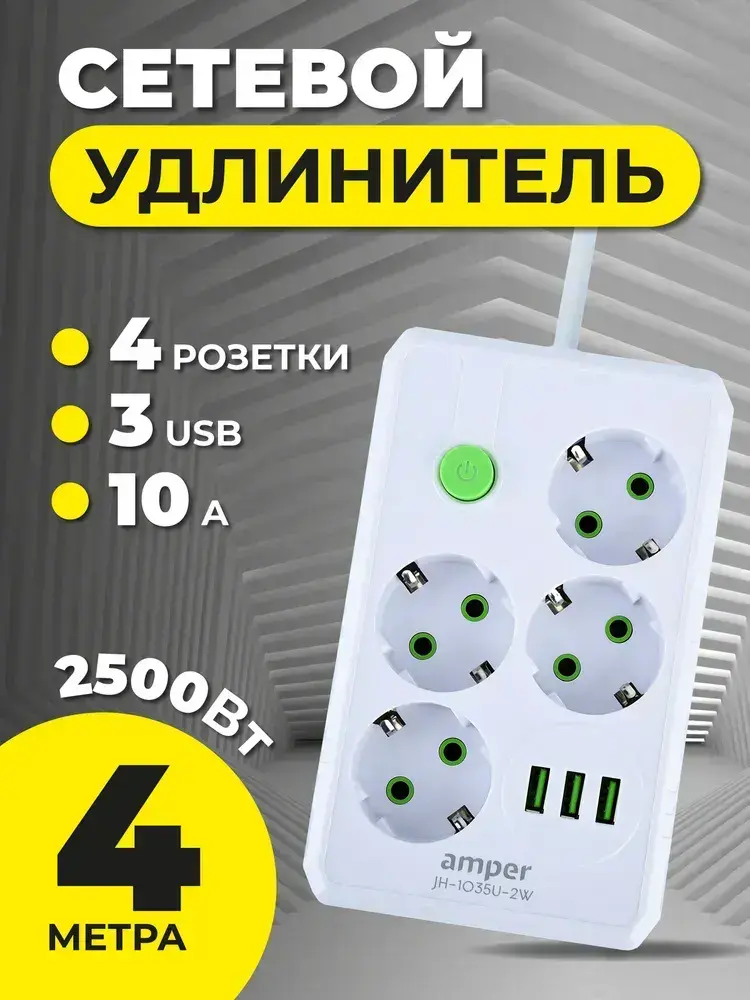 Удлинитель сетевой фильтр 4,0м, 4 р, 10А, 2,5кВт, 3usb