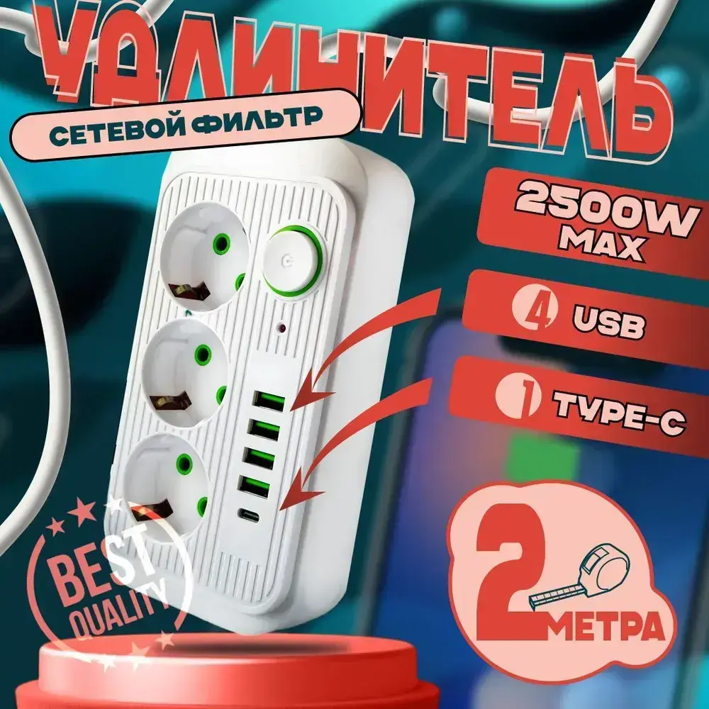 Удлинитель, сетевой фильтр, USB Type C, белый 2м.