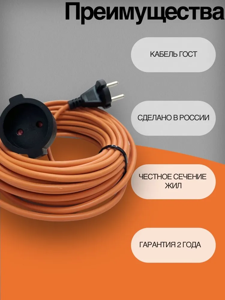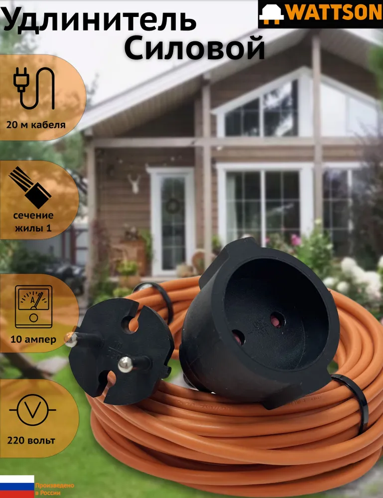 Удлинитель силовой 20 метров, WATTSON, 10А, шнур оранжевый ПВСбм 2х1