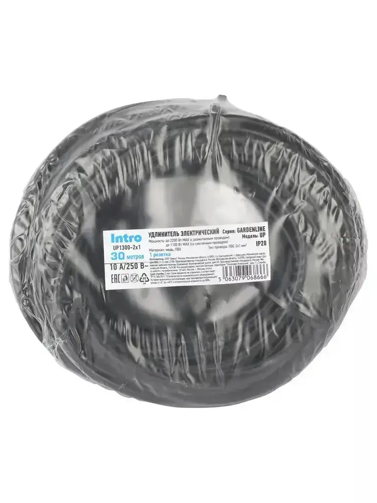 Удлинитель силовой 30м в бухте Intro UP1300-2x1 без заземления 1 розетка ПВС 2х1мм, строительный садовый для газонокосилки и триммера