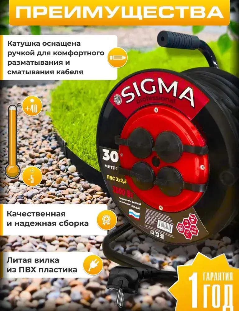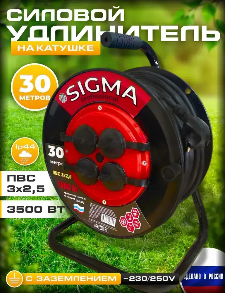Удлинитель силовой на катушке 30 м, 4 розетки, ПВС 3х2,5мм IP44, 3500Вт