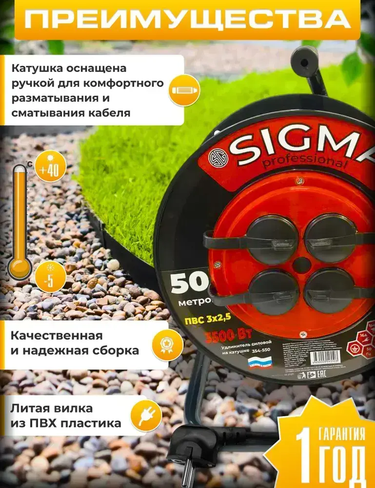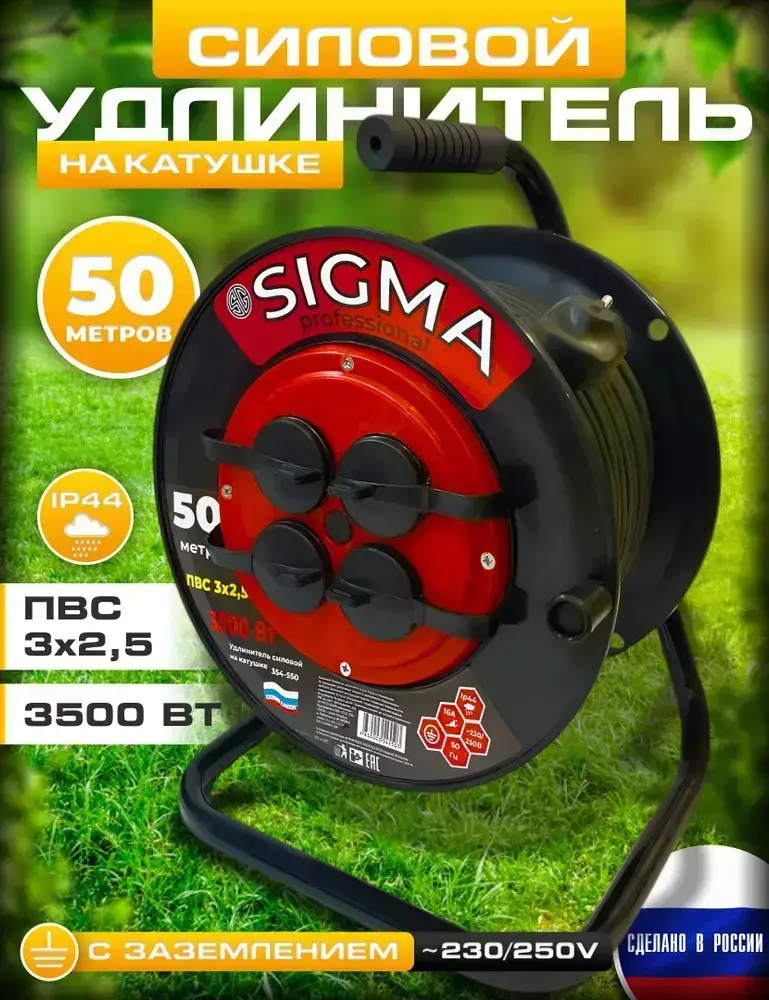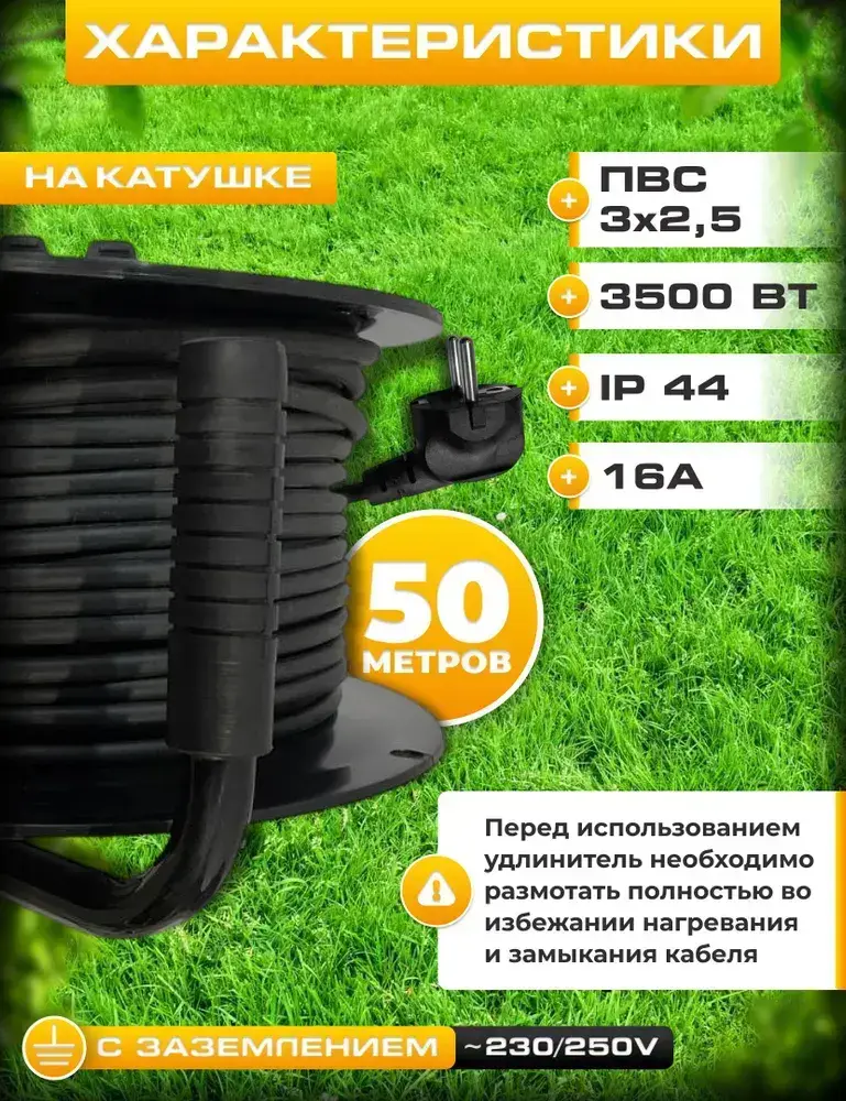 Удлинитель силовой на катушке 50 м, 4 розетки, ПВС 3х2,5мм IP44, 3500Вт