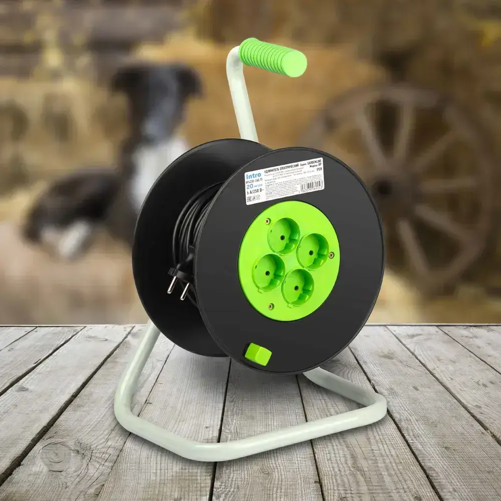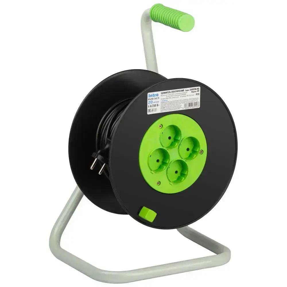Удлинитель силовой на катушке Intro RP4200 20м без заземления 4 розетки ПВС 2х0.75мм, строительный садовый для газонокосилки и триммера