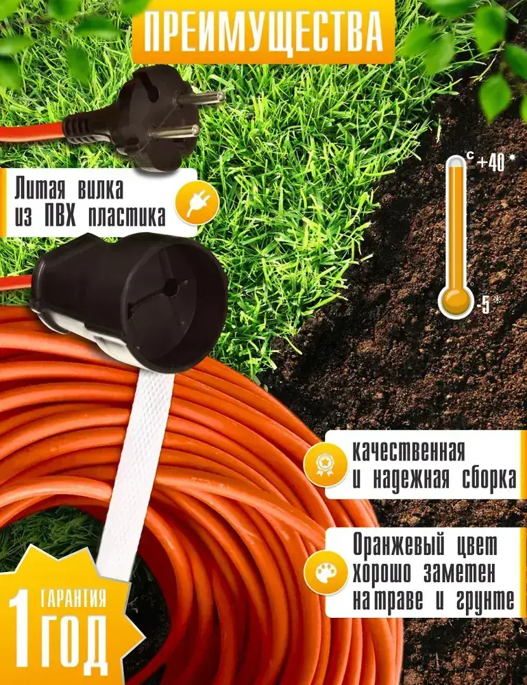 Удлинитель силовой шнур 30м, 1 розетка, ПВС 2*1мм IP20