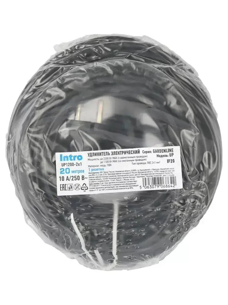 Удлинитель силовой в бухте Intro UP1200 20м без заземления 1 розетка ПВС 2х1мм, строительный садовый для газонокосилки и триммера