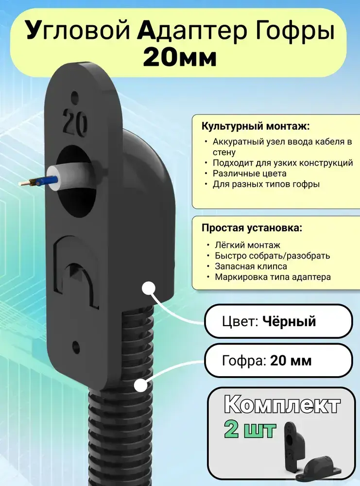 Угловой Ввод гофры в стену 20 мм, чёрный - 2 шт, Угловой адаптер гофры, Кабельный ввод