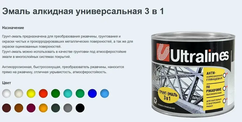 УЛЬТРА ЛАЙНС Грунт-эмаль Гладкая, Быстросохнущая, Алкидная, Уретано-алкидная, Глянцевое покрытие, 1.8 кг, серый