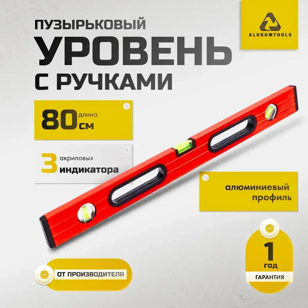 Уровень строительный с ручками 80 см, окрашенный, ALUKOMTOOLS