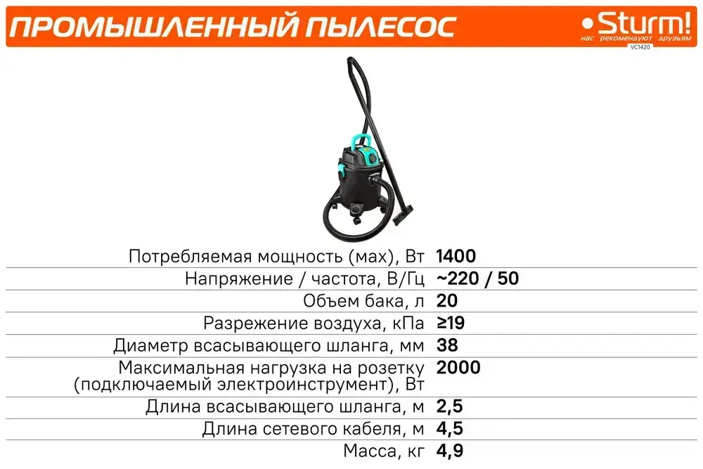 VC1420 Промышленный пылесос 1400Вт, 20л, САМООЧИСТКА, синхр.роз.2кВт Sturm!