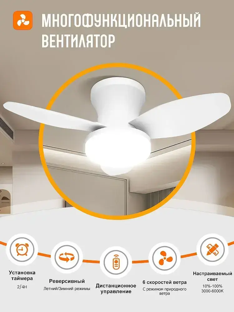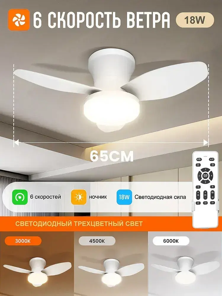 Вентилятор потолочный с пультом, диаметр 65 см, Белый