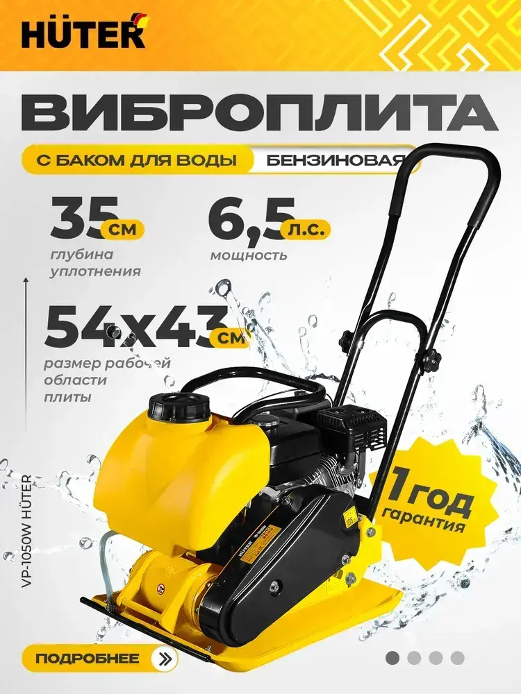Виброплита бензиновая VP-1050W Huter - с баком для воды; 6,5 л.с.; площадка 540*430мм, 88 кг
