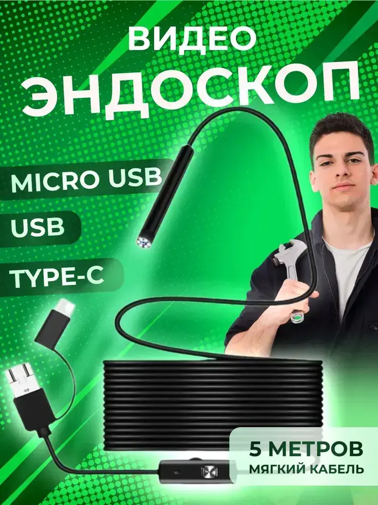 Видеоэндоскоп ATR для смартфона и ПК. USB / Micro USB / Type-C, 5 метров, Водонепроницаемый (мягкий кабель)