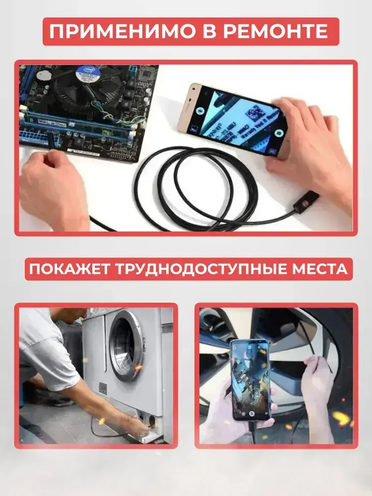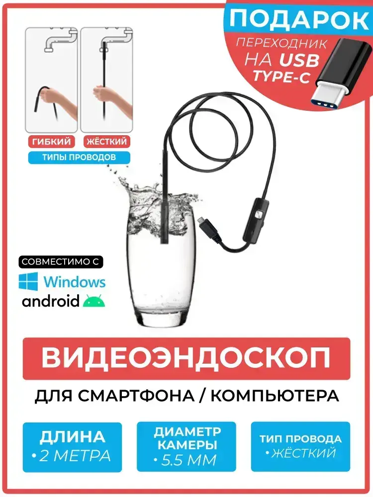 Видеоэндоскоп для мобильных устройств ЖЕСТКИЙ (фиксируется) провод 2 метра, 640x480, Эндоскоп Type C, водонепроницаемый, MicroUSB, USB, TypeC