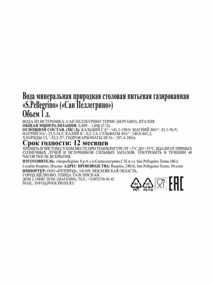 S.Pellegrino - минеральная вода натуральной газации, которая добывается из термальных источников, расположенных а предгорье Альп на севере Италии. Тонкий вкус и сбалансированное содержание газа прекрасно подчеркивают вкус еды и делают S. Pellegrino непременным атрибутом гастрономической кухни во всем мире! Мы хотим сообщить, что теперь бутылки S.Pellegrino упакованы в прозрачную пленку. Каждая бутылка теперь содержит специальный QR-код «Честный Знак», согласно требованиям Федерального закона РФ о маркировке. С помощью QR-кода вы всегда сможете подтвердить оригинальность продукта. Основной состав, мг/л: HCO3- (207,4-280,6); Ca2+ (141,1-190,9); SO42- (340,8-461,2); Cl- (42,2-57); Na+ (25,5-34,5); Mg2+ (42,1-56,9); K+ (1,05-3,4). Общая минерализация, г/л: 0,809-1,000 Пищевая ценность на 100 мл: белки – 0 г, жиры – 0 г, в том числе насыщенные жирные кислоты – 0 г; углеводы – 0 г, в том числе сахара – 0 г; пищевые волокна – 0 г, расчетное количество соли - 0 г.