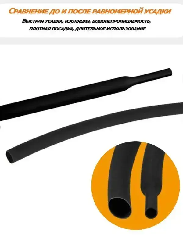 Водонепроницаемая термоусадочная трубка диаметром 6 мм с клеевым слоем, соотношение термоусадочных свойств 4:1, черная, 1,22 метра