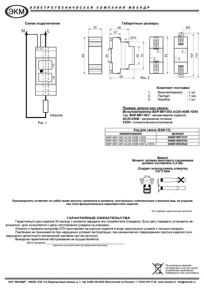 Вольтметр/Амперметр ВАР-М01-083 АС20-450В, Меандр
