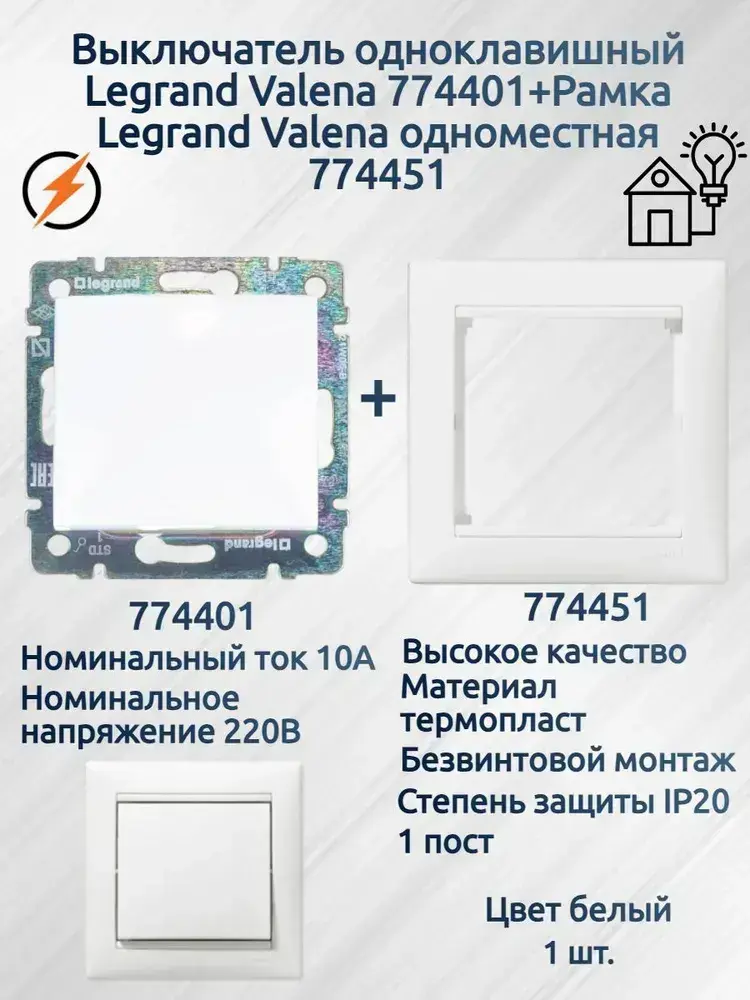 Выключатель одноклавишный Legrand Valena 774401+ рамка Legrand Valena 774451 белый- 1 шт.