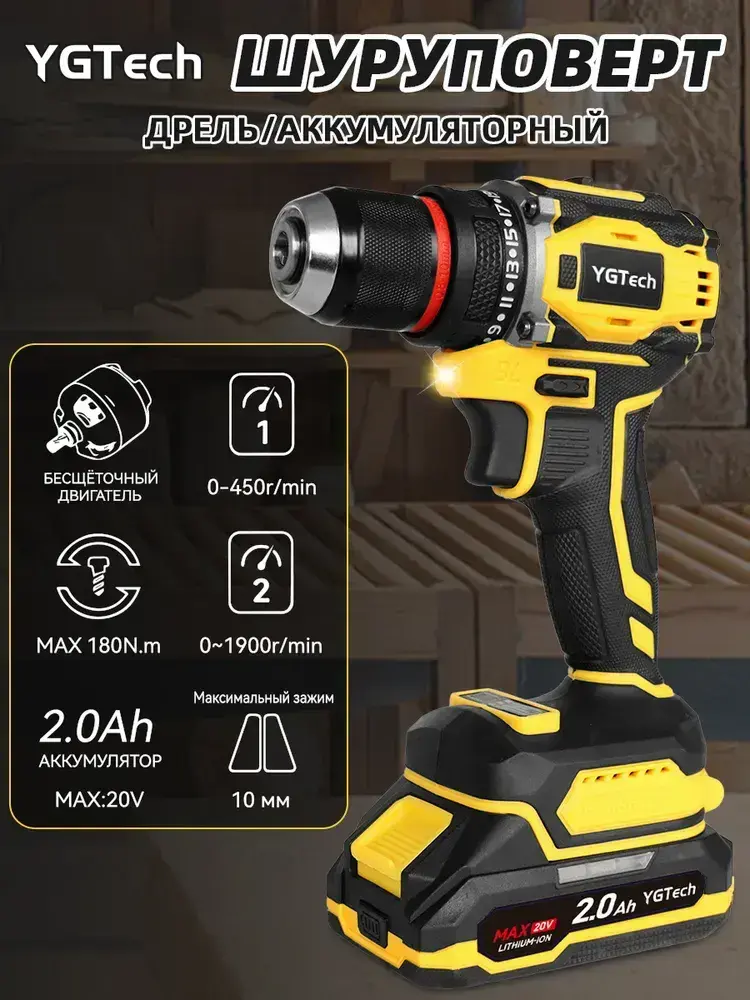 YGTECH Дрель-шуруповерт, 26 В, 60 Нм, 2 АКБ