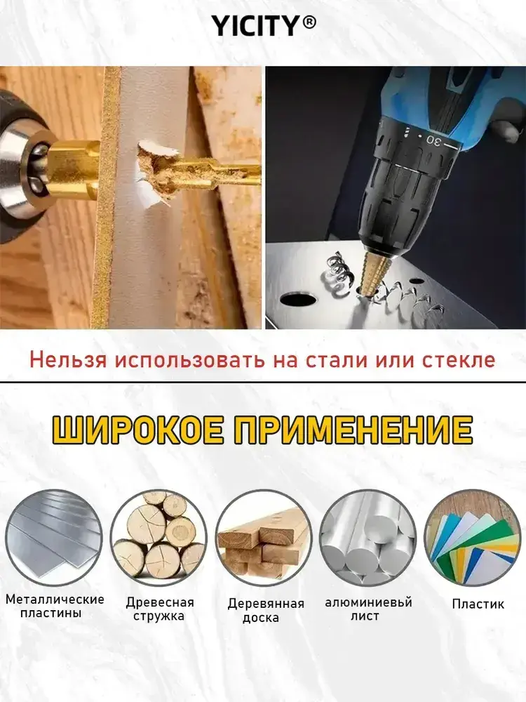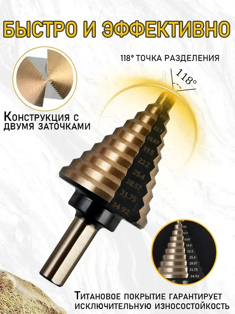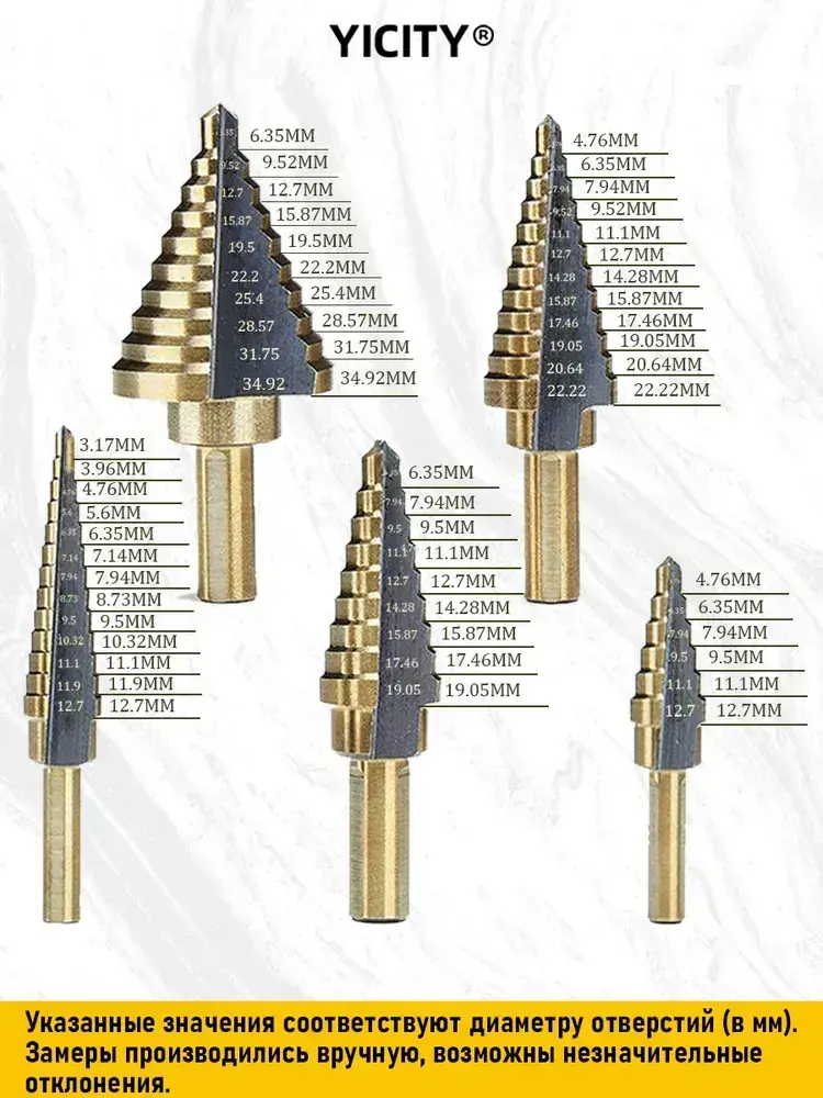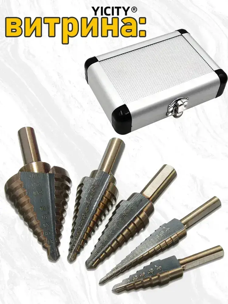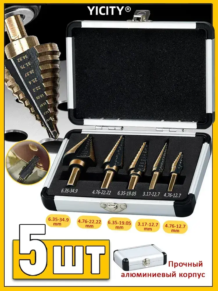 YICITY Набор ступенчатых сверел по металлу с титановым покрытием в кейсе 5шт (6-35, 5-22, 6-19, 5-13, 3-12мм)/трехгранный хвостовик/набор сверел по металлу