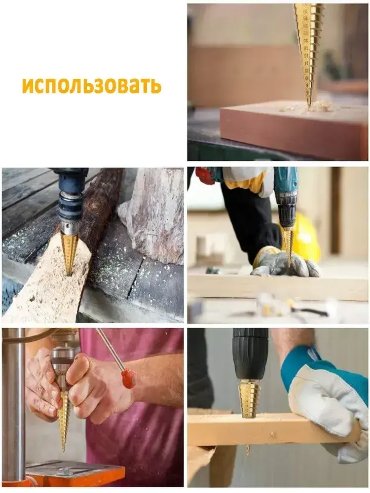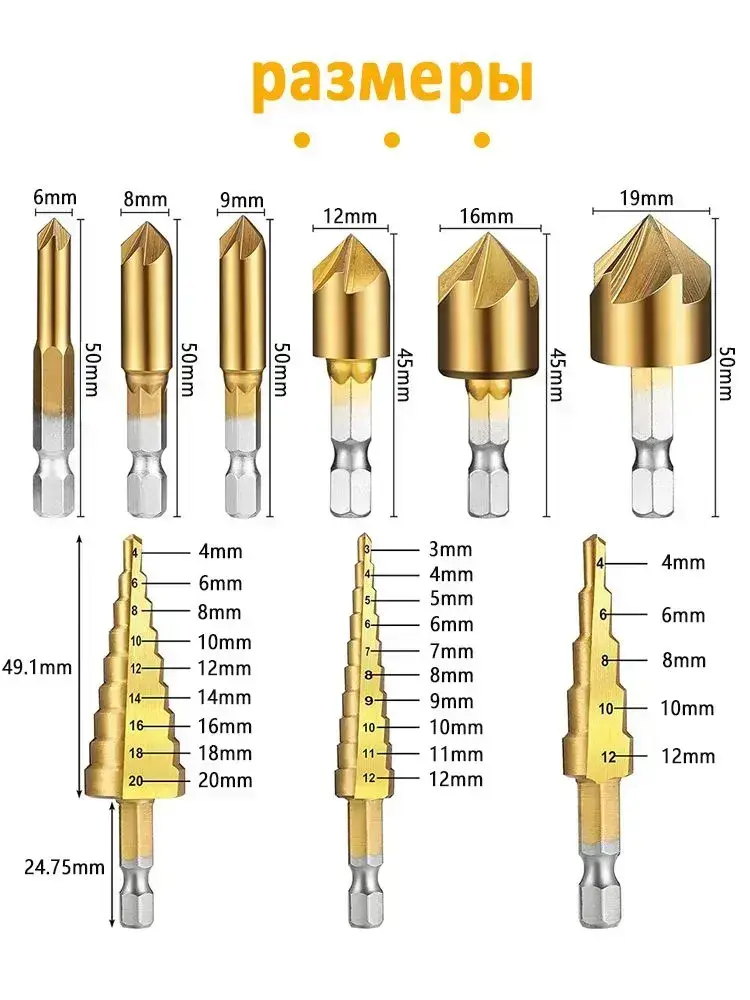 YICITY Набор ступенчатых сверл (4-12мм, 3-12мм, 4-20мм) 3 шт + 6 шт Набор зенкеров по металлу и дереву 6, 8, 9, 12, 16 и 19мм + Кернер автоматический