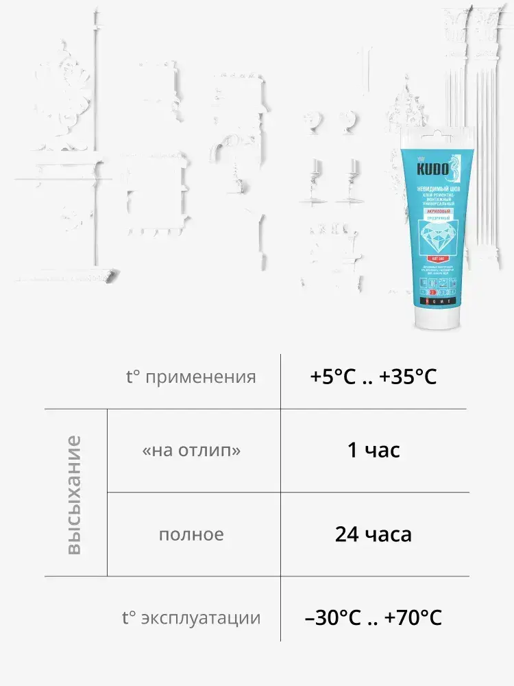 Жидкие гвозди - невидимый шов KUDO "KBT 300", монтажный клей, акриловый, прозрачный